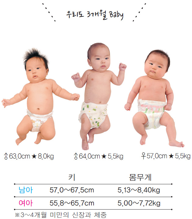 3개월 차에 신생아는 목을 가눌 수 있으며 엎드려 눕혀놓으면 무릎으로 몸을 지탱하고 목을 들어 올릴 수 있습니다.