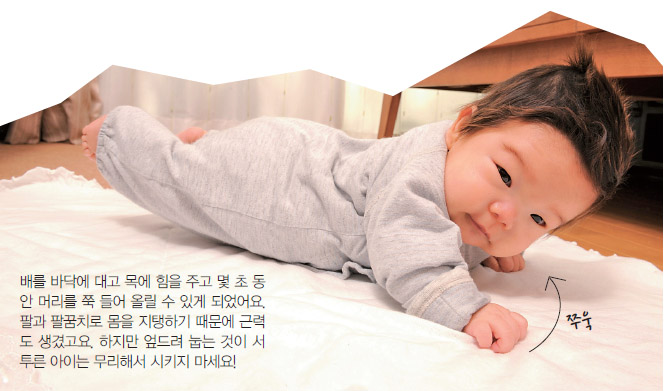 아직 제대로 목을 가누지 못하는 아이도 있지만 조금씩이라도 목에 힘을 준다면 걱정하지 마세요.